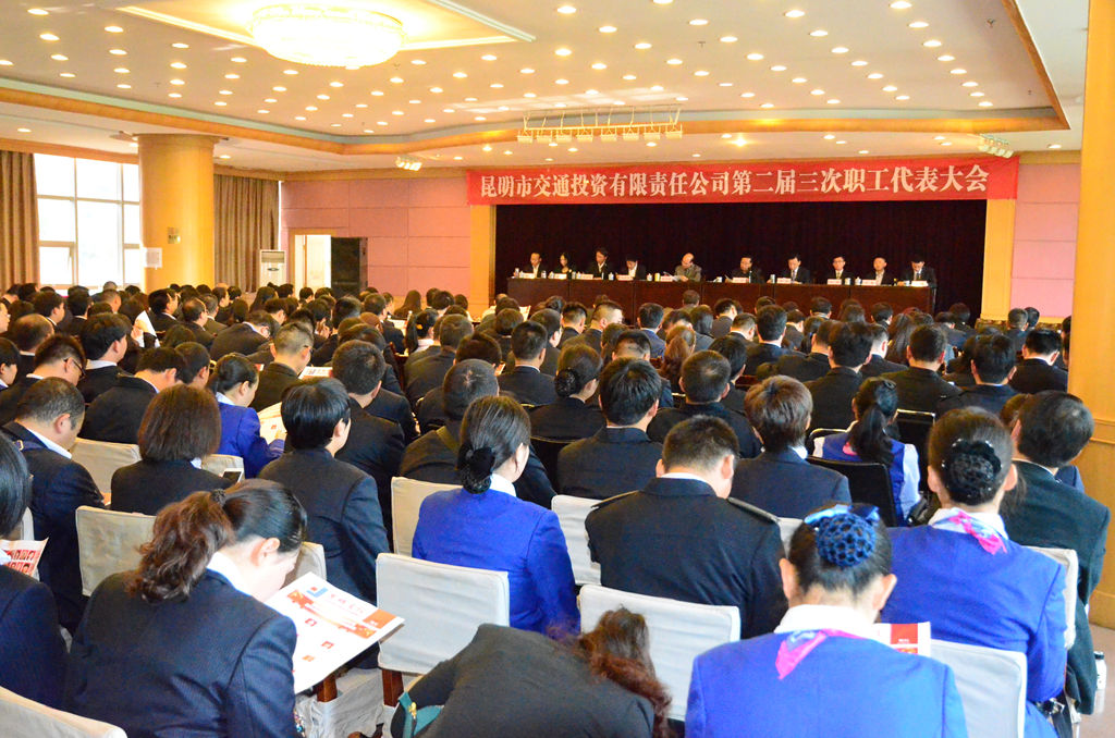 2015年4月24日,昆明市交通投资有限责任公司在三楼一号会议室召开第二届三次职工代表大会。公司董事长雷升逵、总经理金炜,公司外部董事詹明安、杨昆慧,公司监事会主席张顺朝、监事杨顺丽、王德琴,公司党委副书记、工会主席薛军等领导成员出席会议。公司本部全体人员及下属公司中层及以上干部、先进集体、先进个人代表;二届职工代表大会代表等280余人参加了会议。会议由公司副总经理许哨同志主持。